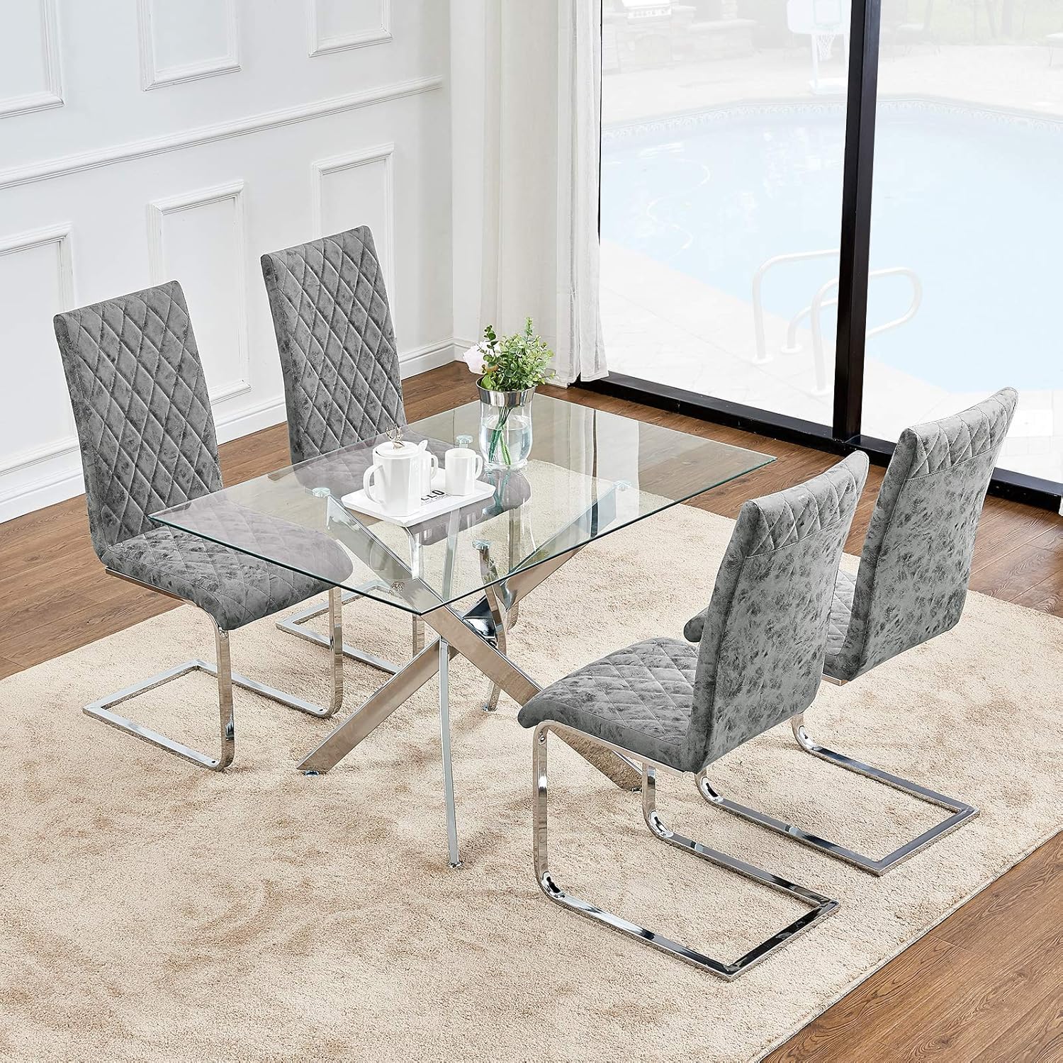 Clear Glass Dining Table And 2 Chairs Set Modern Faux Leather High Back 90cm Round Tempered Top Chrome Legs Sturdy Home Kitchen Living Room Office Table Set Table 2 Ash Grey Chairs Buy Online from images-na.ssl-images-amazon.com All clear dining room sets can be shipped to you at home. Mealtime should always be a pleasant and joyful event, which is why breaking bread with family and friends on a beautiful dining table transforms a meal into a very special experience. 4.1 out of 5 stars. ( 0.0) out of 5 stars. 4.7 out of 5 stars. Dining room set 4 chairs. The 5 pieces kitchen table set comes with a simple design and lightness fresh color bring your home new energy. Get 5% in rewards with club o!